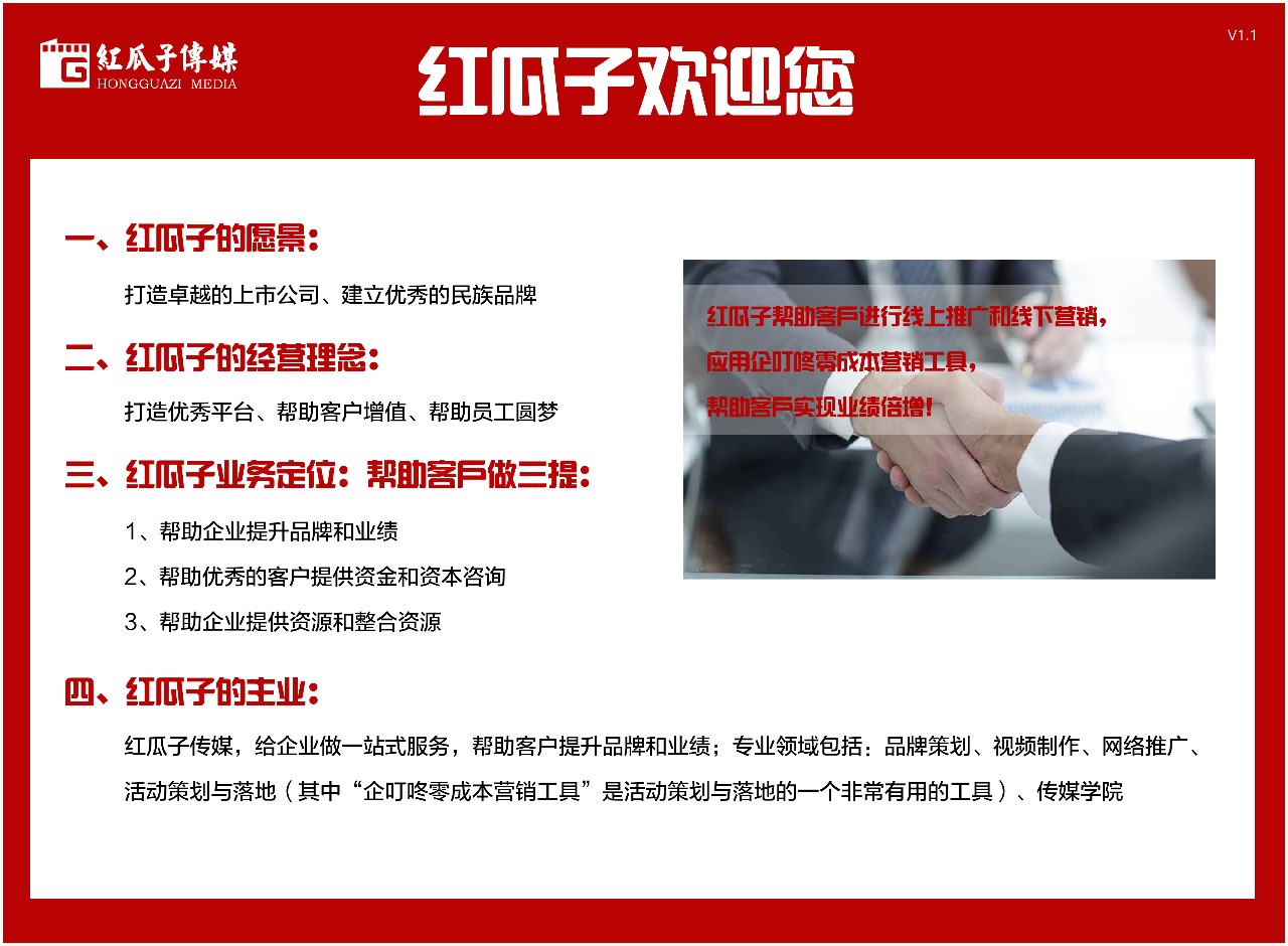 9、经营理念:“打造优秀平台,帮助客户增值、帮助员工圆梦”,这是写在红瓜子企业文化中的最重要的一条,未来的竞争是企业文化的竞争,企业文化对内凝结人心,打造团队,对外吸引客户,组成同盟,现在已经是营销3.0时代,企业文化是优秀供应商评估的重要指标,红瓜子企业文化的理念是打造优秀平台,帮助客户增值、帮助员工圆梦,客户的认同和体验感是红瓜子最重要的追求