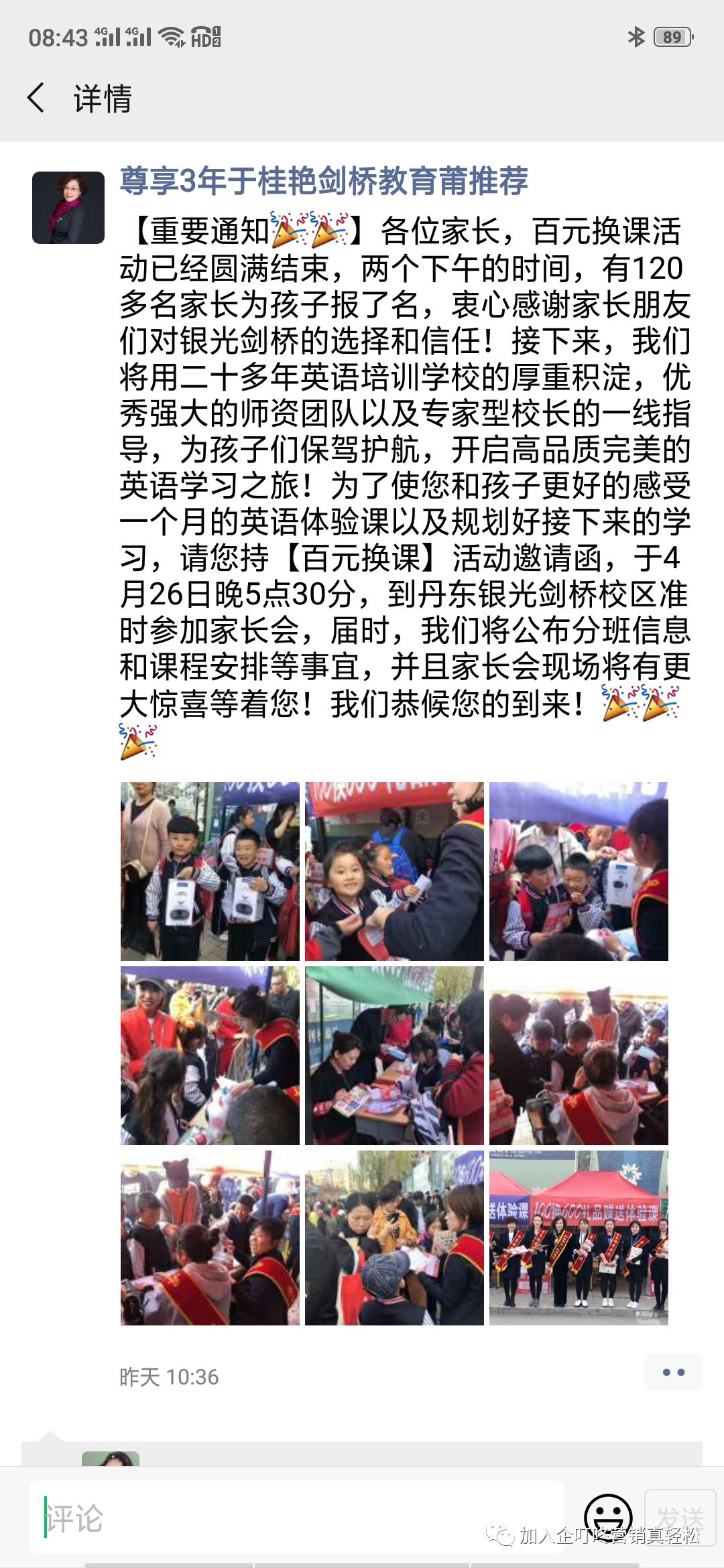 23、24日两天下午的活动主题是——100元换600礼品赠送400元的体验课。仅仅两个下午的时间,成功引流120多人,同时邀请这120多位家长参加26日晚5点30分的《特优赠课》活动,即“续课缴费,交多少送多少”!