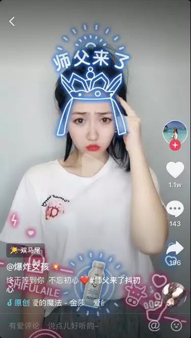 酷炫的灯管风,右下角不断冒出小心心,整个贴纸动态呈现。当你炫技完成,向镜头比心时,“师父来了”四个字就被触发,特效贴纸画面随之到来。