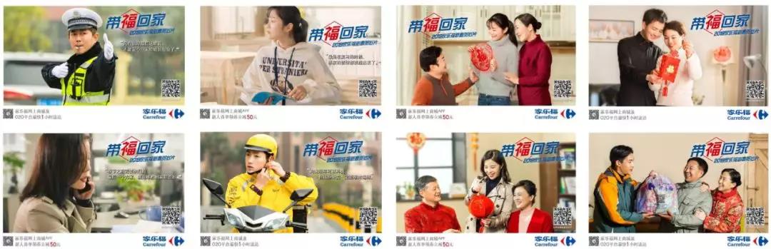 形式有了,内容应当如何选取?家乐福撬动区域节庆消费的“支点”,就在于中国人节日回家必带礼的观念。基于这一观念,家乐福打造《带福回家》TVC和8大主题角色海报,IP化加深内容印记。另一方面,大家都知道传统节日期间,最火爆的地方除了火车站就是超市了,家乐福因而在线下门店同步打造“年货一条街”,为消费者提供更丰富的购物体验,同时与线上传播形成场景呼应,共同传递“去家乐福扫年货”的消费主张。