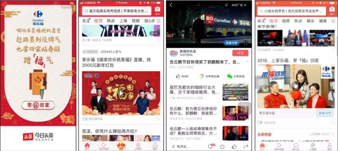 要把握日益稀缺的注意力,传播环节的精准快速必不可少。而巨量引擎为品牌主提供的,就是覆盖多场景的投放资源。在家乐福的TVC传播中,今日头条王牌硬广及巨量引擎全系特色产品投放使总曝光达到25,970,000,总点击量达到842,000,平均点击率3.25%。
