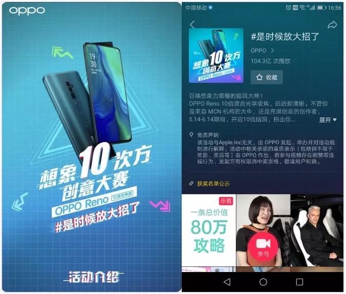 从5月14日起,OPPO举办“想象10次方”创意大赛,以“是时候放大招了”为命题,结合手机摄像头变焦功能,广泛征集竖屏视频作品。无论是来自MCN机构的大咖,还是充满创意的创作者,都有机会通过创意大赛赢取丰厚现金大奖。