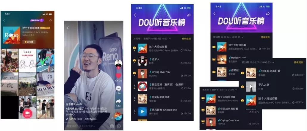 这条单曲使用近50万次,持续3周霸占品牌DOU听音乐榜榜首,不少用户表示“被音乐征服”。@我家大鼠条 等达人使用单曲的作品均获得100万+点赞。朗朗上口的旋律,带动品牌迅速走红全网,被筛选后留下的广告也为OPPO沉淀了丰富的音乐资产。