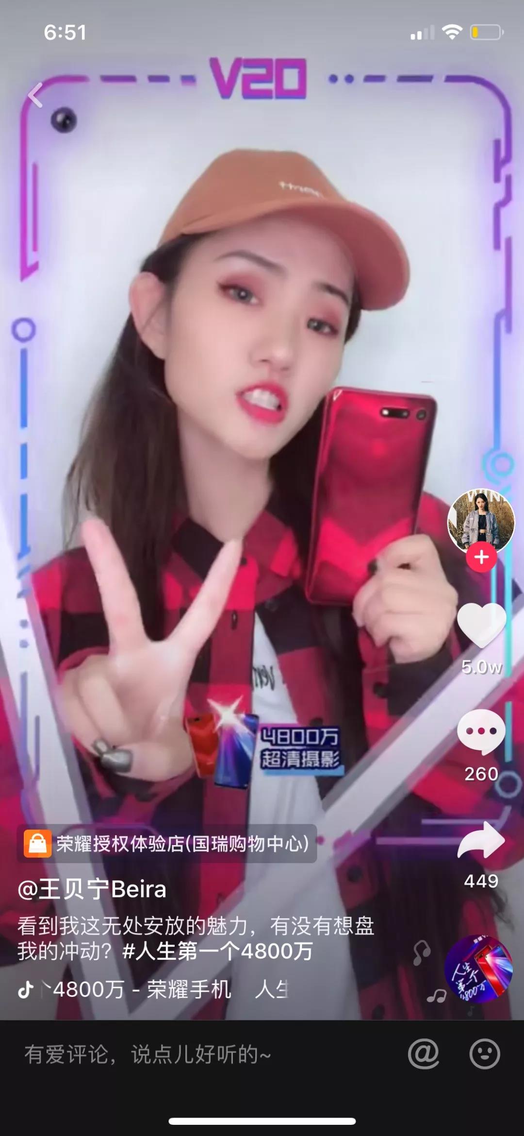 “从一无所有到第一个30万真的很不容易”,常刷抖音的人对这个旁白一定不陌生。这个热门BGM就像学猫叫、好嗨哦一样,只要前奏响起来,每个人的脑海里都会自动接上下一句。由此可见,一款热门BGM对于视频传播的帮助极大。基于对平台玩法的烂熟于心,荣耀手机此次的挑战赛,巧妙改编了抖音“第一个30万”热门BGM,在2400万后融入4800万,并配合视频反转为清晰美型的画面。V20的4800万超清摄像功能伴随着入耳的BGM,成为脍炙人口的产品slogan