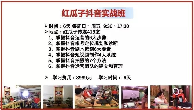 5G时代来临,信息以短视频形式来传播,抖音是全球短视频流量最大的平台,沃尔玛一条抖音增加2000万收入,一条抖音为华为手机单店增加650万收入,怎样用好抖音,对我们个人和公司都非常重要,红瓜子抖音研究院每天都有组织《抖音剧场》节目和每周日都举行《抖音特训营》培训,欢迎大家积极参加