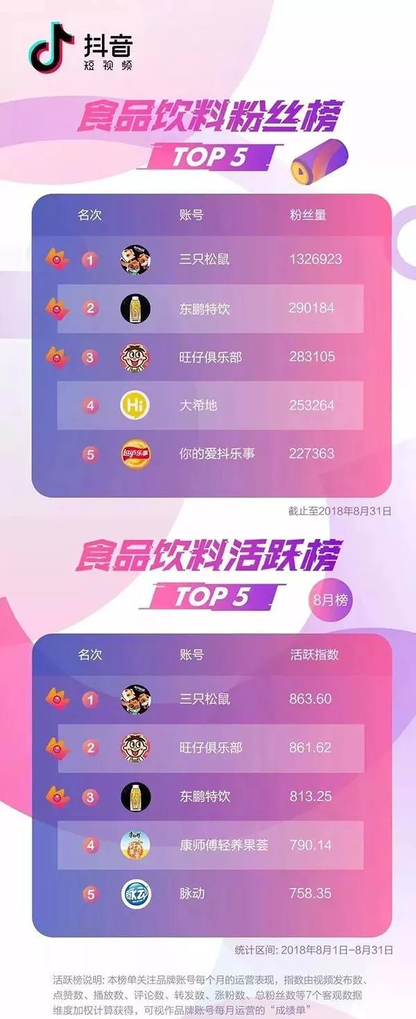 在排行榜中,三只松鼠粉丝量、活跃指数都踞行业榜首;东鹏特饮和旺仔俱乐部在粉丝数和活跃指数排行中都跻身前三。此外,“脉动”发布了26个作品,获得约150万的播放量;“康师傅轻养果荟”也表现出色,整个8月共收获125万点赞。