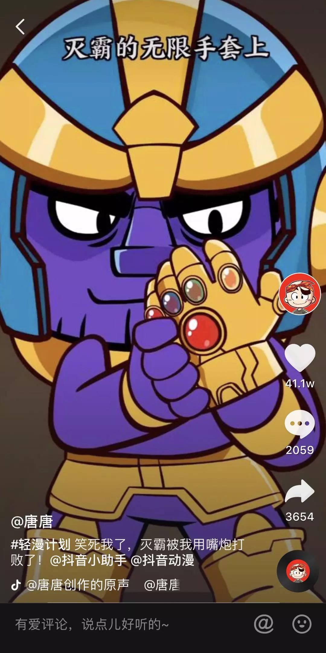 最近,「唐唐」会在视频中加上抖音#轻漫计划#的挑战,目前该话题的播放量达到3.6亿。「唐唐」内容团队说:“用合适的内容参与抖音的官方运营话题,我们可以获得更好的流量和曝光,内容优质的话,就可以被更多的人看到。”