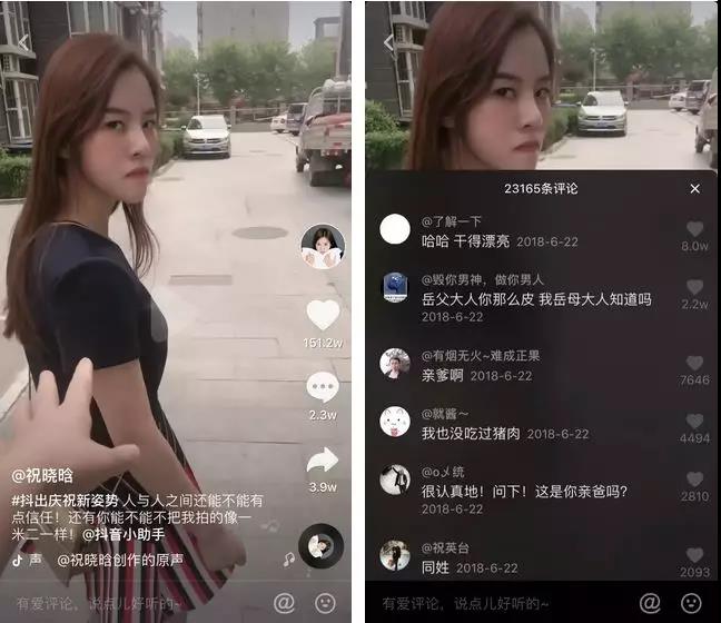 一开始我们也像大多数人刚做抖音的时候一样,模仿抖音热门,对个口型,跳个舞蹈,像祝晓晗的第一条视频内容,就是祝晓晗在我们楼下的商场里,跳的一个舞蹈。