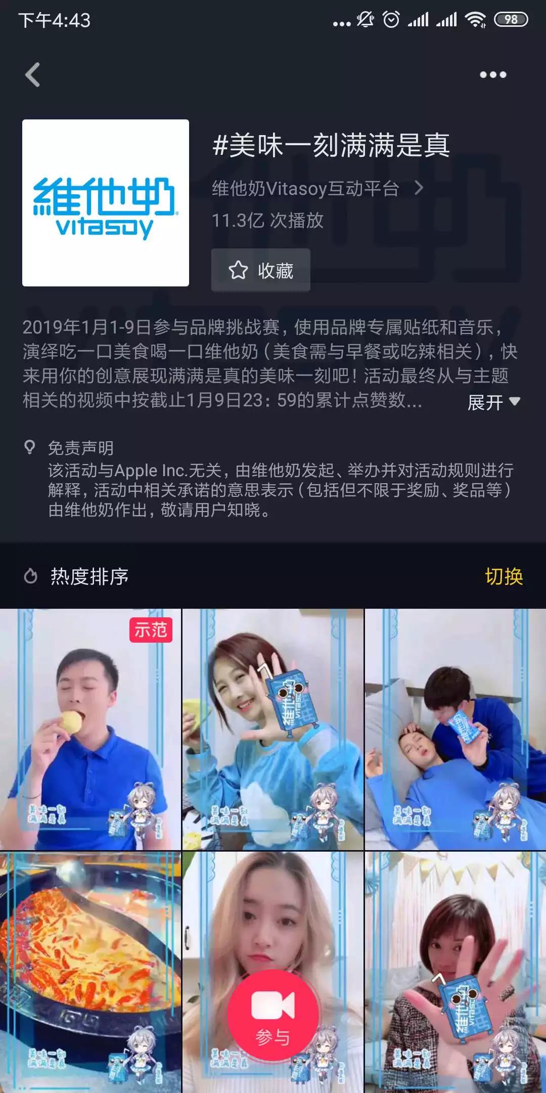 挑战赛开始后,维他奶同步邀请两名拥有百万粉丝的达人@江离 和@小步和娇娇 参与挑战赛。两位达人分别根据自身的特点和优势,创作出优质参赛视频,带动#美味一刻满满是真#热度迅速上升。