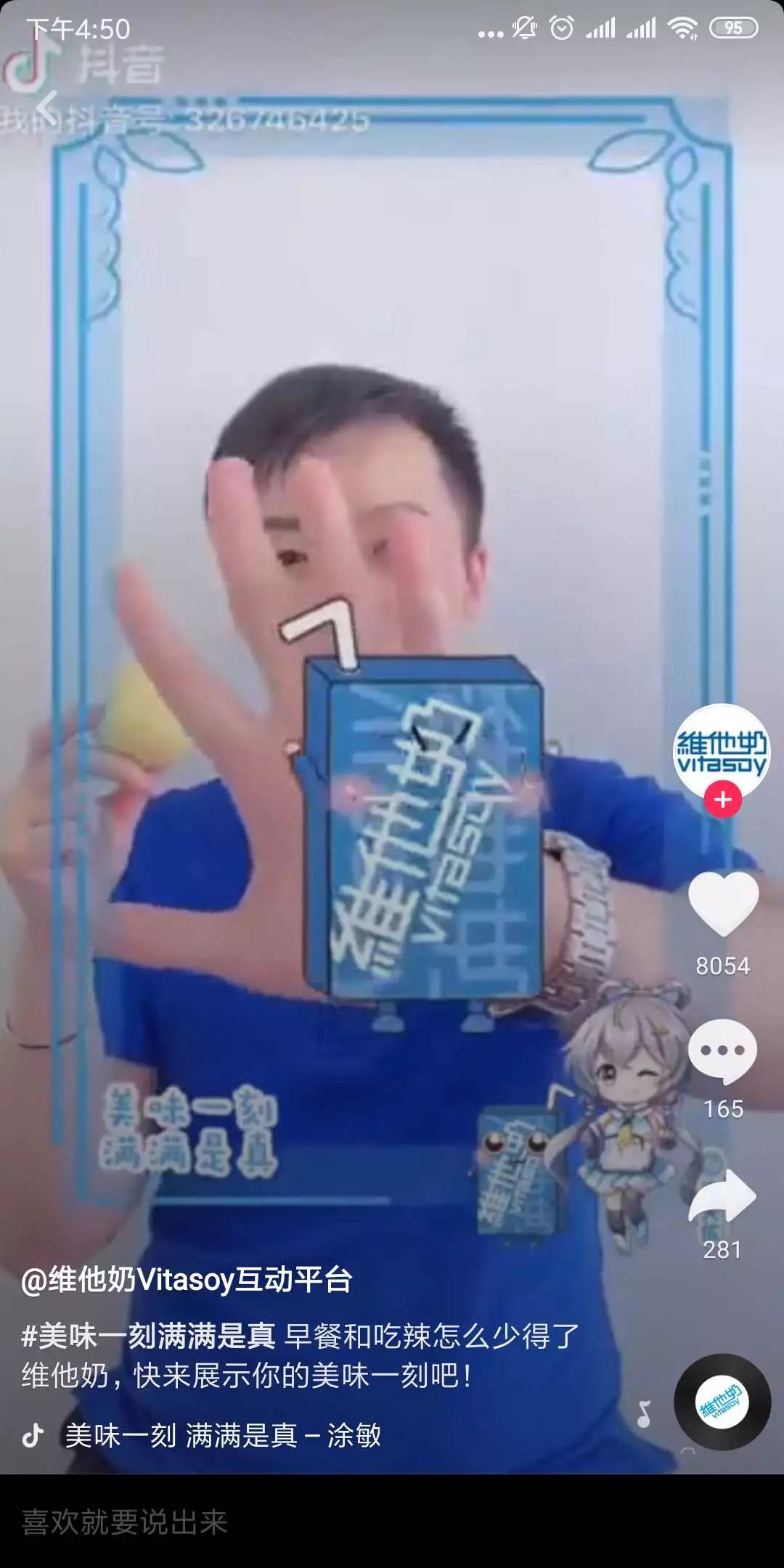 维他奶不但在抖音贴纸的IP联动上猛下工夫,在贴纸玩法设置更是别处心裁。借助抖音领先的手势识别技术,维他奶打造了一款十分趣味的手势互动贴纸。用户只要在镜头面前伸出手掌,就能在掌心处召唤会跳舞的“维他小盒”。通过趣味玩法植入品牌信息,降低了用户对广告信息的抵触,提高年轻用户对品牌的好感度。